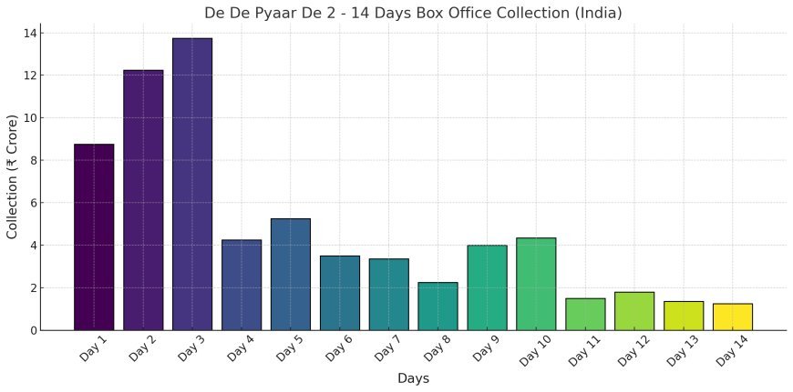 Explore the 14-day box office collection trend of De De Pyaar De 2 in India! This dynamic chart highlights the film’s performance, from its opening weekend to its second week. The gradient colors, transitioning from green (growth) to yellow (moderate change) to red (decline), give a clear visual representation of how the collections fluctuated over the two-week period. Stay updated on the film’s financial success and track the highs and lows of its journey at the box office.